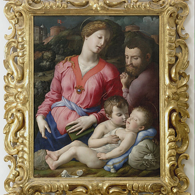 Come testimoniano gli storiografi Giorgio Vasari (1568) e Raffaello Borghini (1584), fu il fiorentino Bartolomeo Panciatichi, il cui stemma domina il bastione nello sfondo, a commissionare quest’opera al Bronzino. Ispirandosi alle forme scultoree della pittura di Michelangelo, il pittore ha rappresentato l’incontro della sacra famiglia con Giovanni Battista al ritorno dalla fuga in Egitto, come testimonia la presenza del fagotto da viaggio sul quale riposa il piccolo Gesù. Si trova agli Uffizi dal 1919.